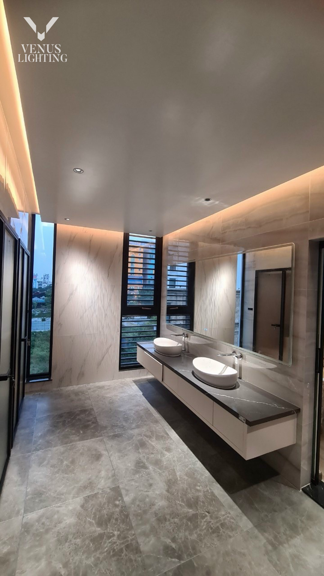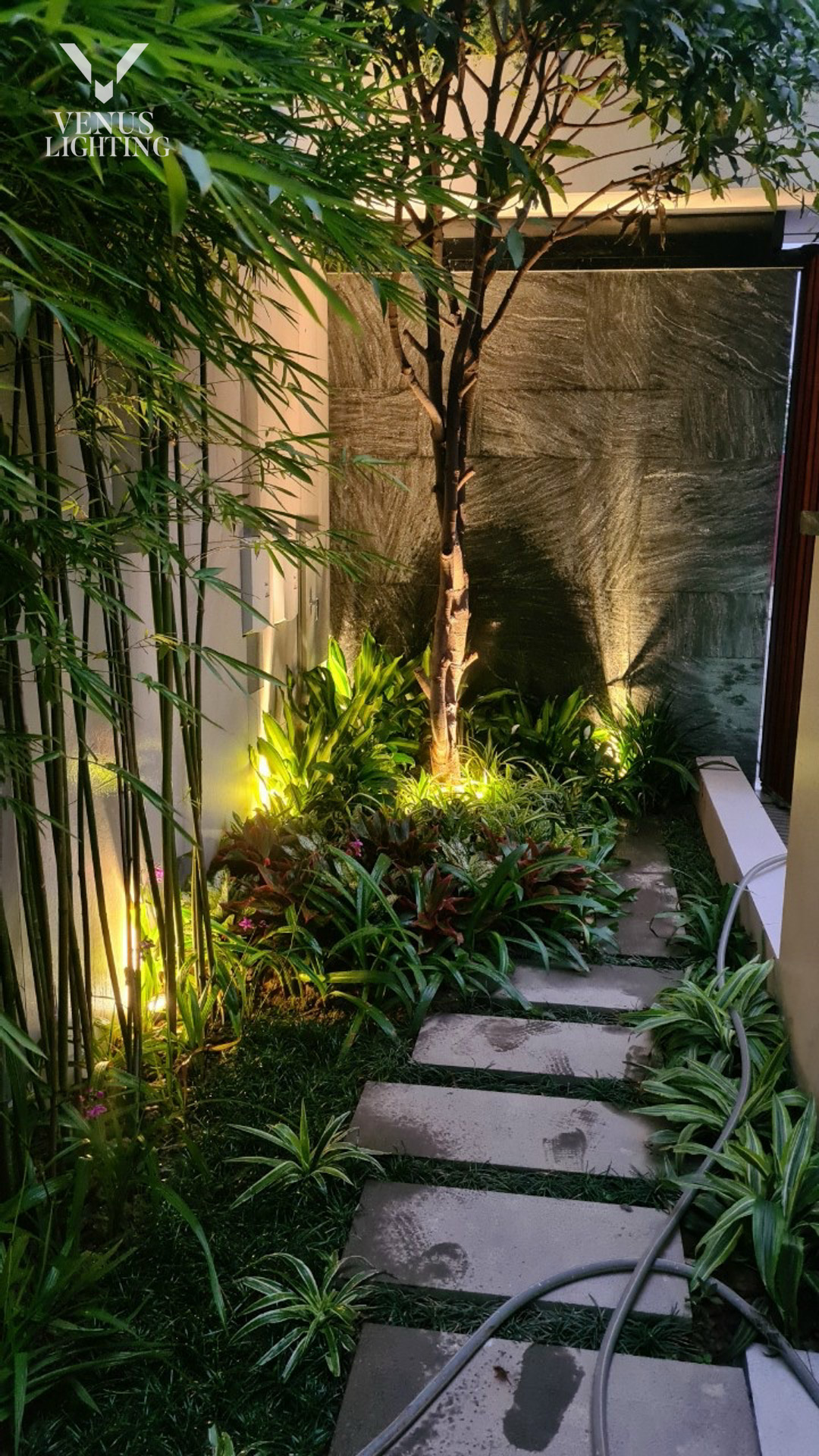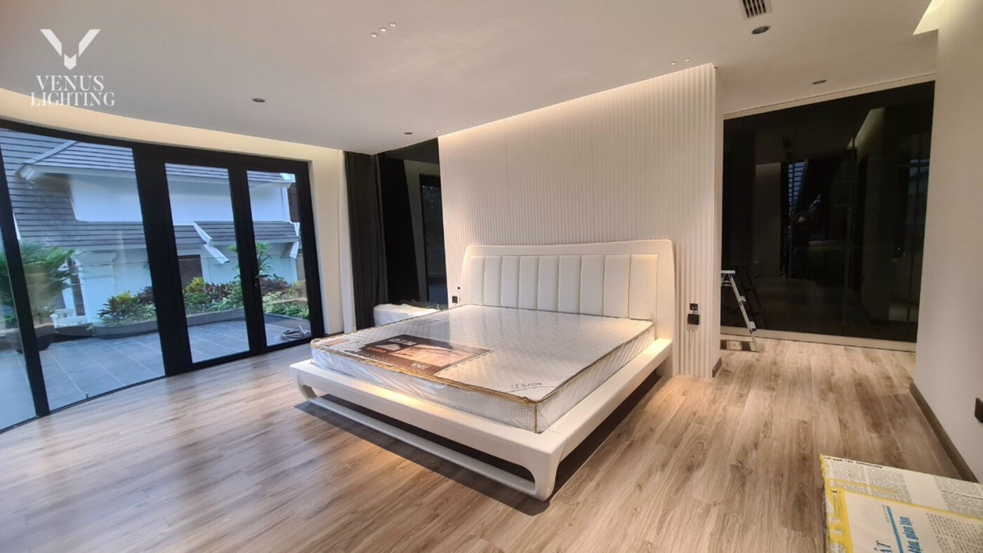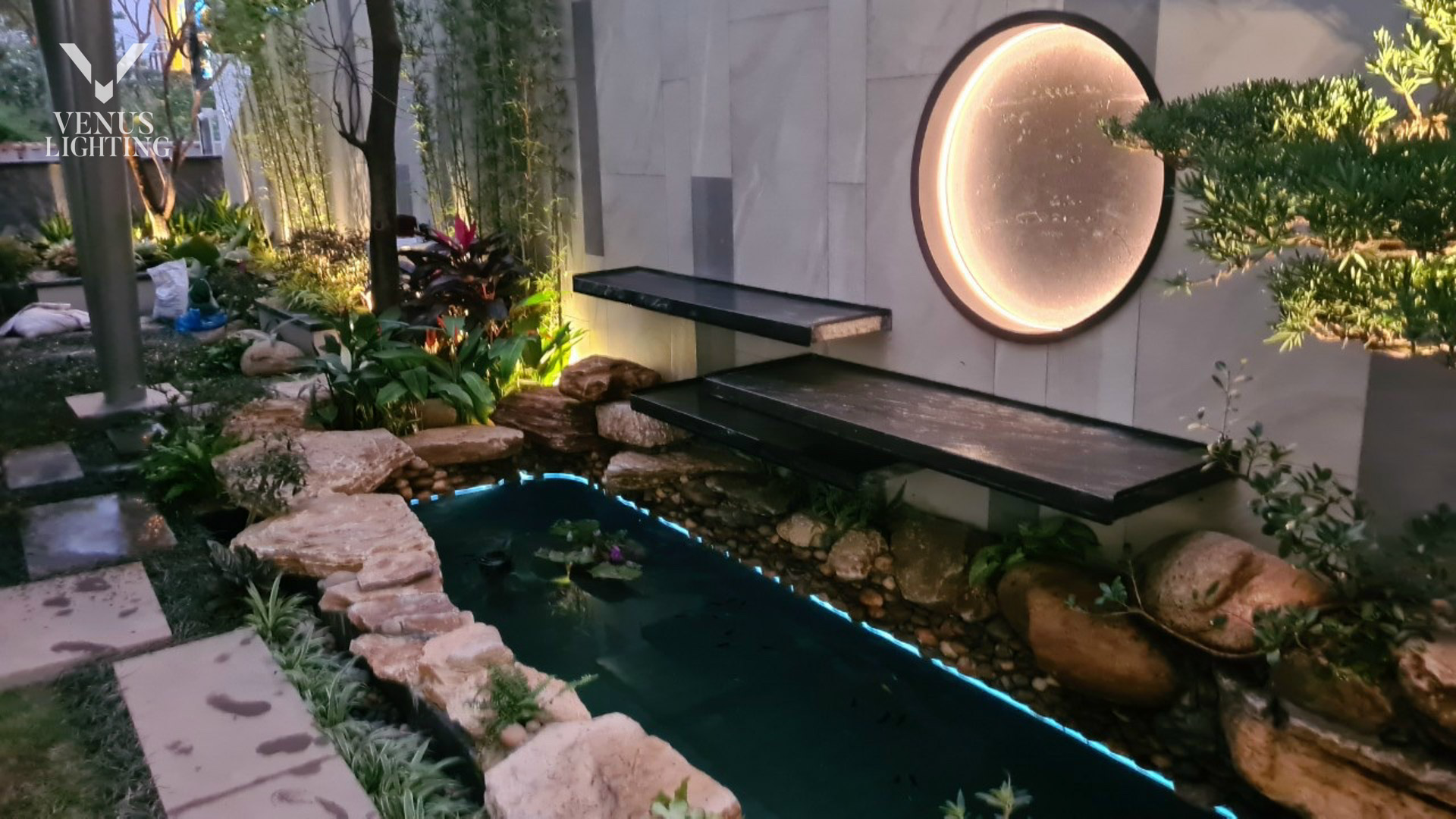 Chiếu sáng biệt thự được thiết kế tinh tế, kết hợp hài hòa giữa ánh sáng trong nhà và ngoài trời. Khu vườn sử dụng đèn chiếu điểm và đèn hắt tạo chiều sâu, làm nổi bật cây cảnh và tiểu cảnh. Không gian nội thất dùng ánh sáng gián tiếp dịu nhẹ, tôn lên vẻ sang trọng, thư giãn và đẳng cấp của ngôi nhà.